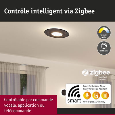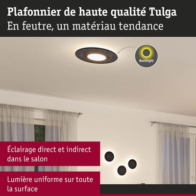 Le plafonnier LED intelligent Tulga en feutre et coloris Anthracite avec 2000lm / 850lm impressionne par son design moderne et sobre et crée une atmosphère agréable. En outre, ce multitalent réduit les bruits de fond dérangeants. Autre atout : ce luminaire est en matériau durable et recyclable. La technologie Backlight crée une atmosphère de bien-être particulière et donne comme l’impression que l’éclairage du plafonnier est en apesanteur. La fonction Tunable White permet de varier la température de couleur à votre guise : du blanc lumière du jour pour le travail au blanc chaud idéal pour la relaxation. Le luminaire est compatible Zigbee 3.0. ZigBee 3.0 est un protocole de transmission radio qui met en réseau les appareils de différents fabricants.