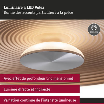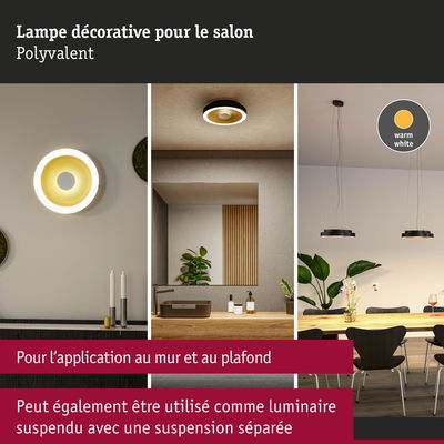L’applique et le plafonnier Volea en Noir/Doré avec un diamètre de 320mm est plus qu’une solution d’éclairage ordinaire. Avec sa combinaison unique d’éclairage direct et indirect, renforcée par l’effet de profondeur tridimensionnel dans le cercle intérieur du luminaire, chaque pièce baigne dans une ambiance chaleureuse et atmosphérique. La lumière blanc chaud d’une température de couleur de 3000 Kelvin crée une agréable atmosphère de bien-être, que ce soit dans le salon, la chambre à coucher ou même la salle de bain grâce à la protection IP 44. Elle est gradable en continu, ce qui permet d’adapter la luminosité. En outre, le luminaire peut également être suspendu à l’aide d’un support séparé afin de placer la lumière de manière ciblée au-dessus de la table à manger ou du comptoir de la cuisine.