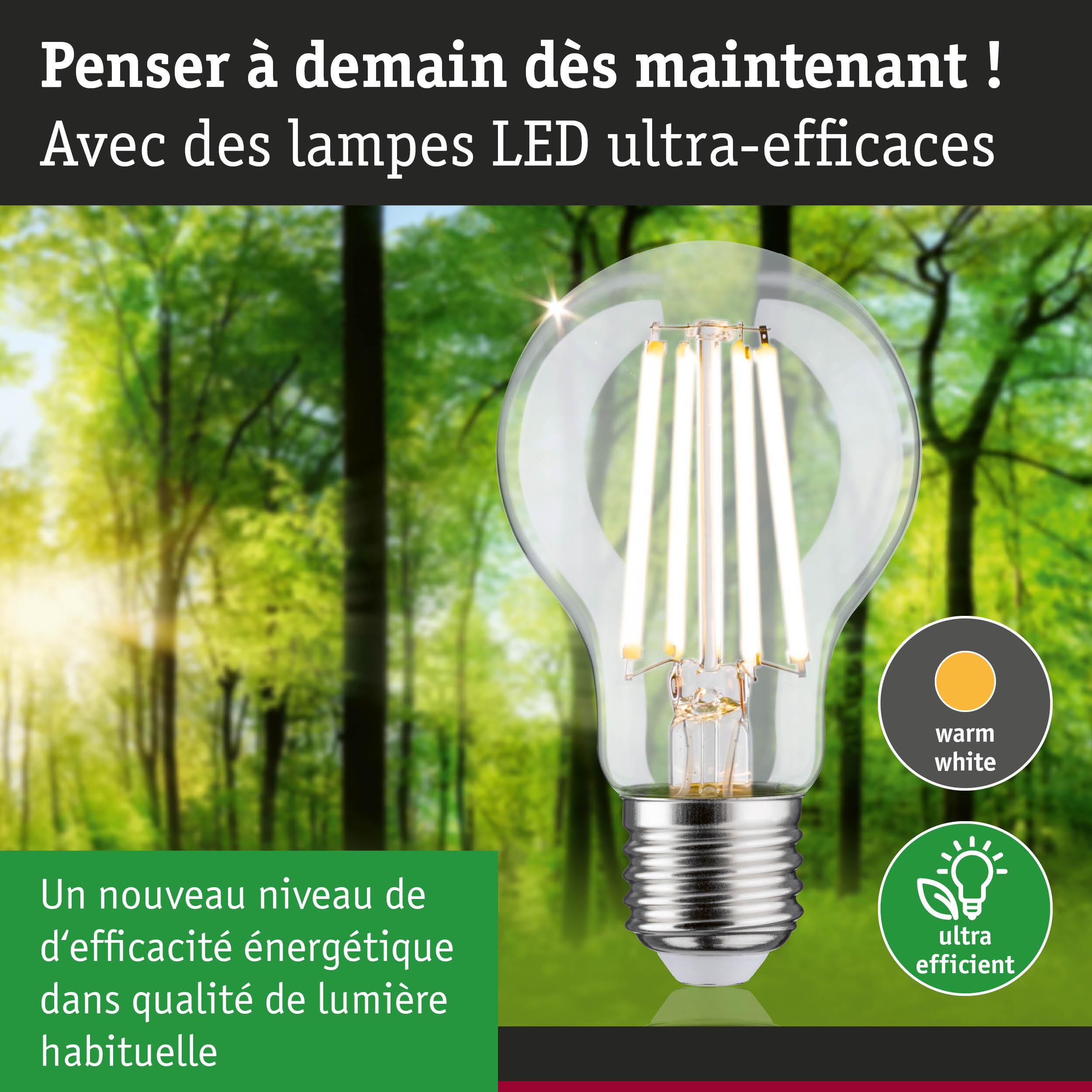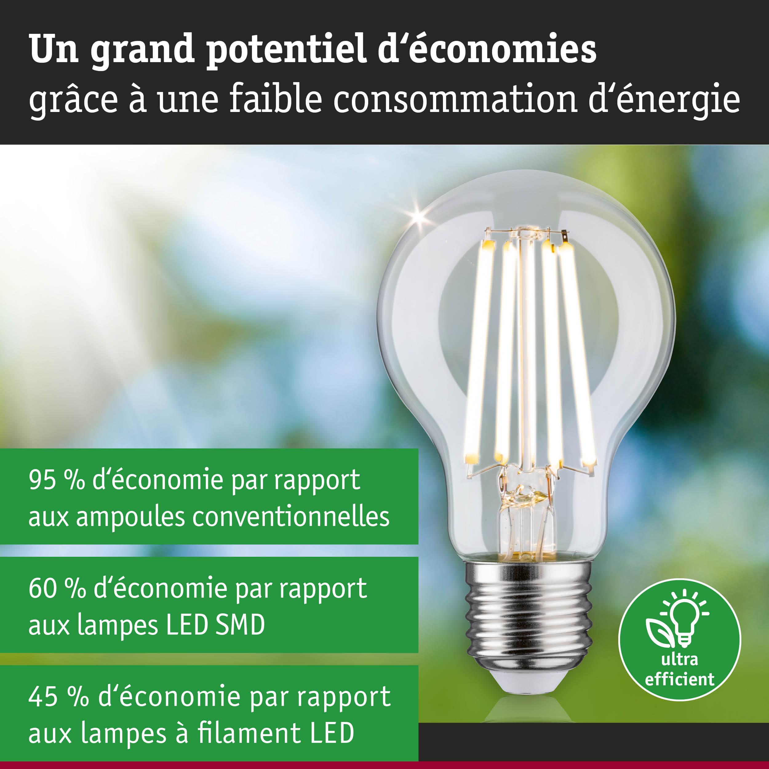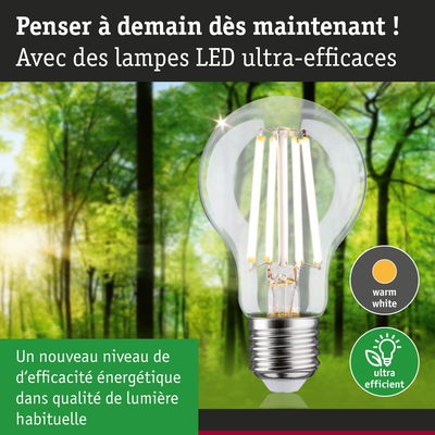 Les ampoules ultra efficaces de l'Eco-Line combinent innovation et durabilité. Grâce à une consommation d'énergie réduite de 60 % et à une durée de vie résolument plus longue que celle des ampoules LED standard, il est possible de réduire considérablement les coûts énergétiques tout en préservant l'environnement. L’ampoule LED à filament avec 3000K, une puissance de 4,5W et 840lm diffuse un éclairage uniforme agréable sans teinte verdâtre. L’ampoule est compatible avec les douilles E27 conventionnelles. Éclaire de façon uniforme même les plus grands abat-jour. L’ampoule est gradable en continu. Les ampoules LED Paulmann portant le label Eye friendly produisent une lumière confortable qui préserve les yeux. Que ce soit pour travailler, lire ou se détendre, les lampes contribuent à un meilleur confort visuel.