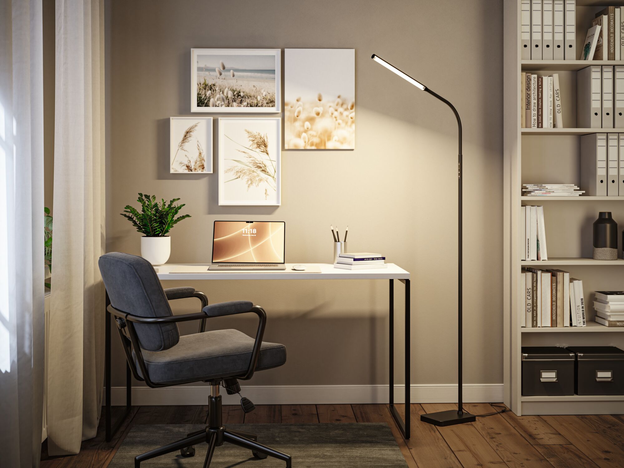 Travaillez efficacement grâce à un éclairage adapté ! Avec ses 1450 lumens, ce lampadaire à la technique sophistiquée a été spécialement conçu pour répondre aux exigences des bureaux à domicile modernes. Un réglage en continu de sa luminosité permet d’adapter avec précision son intensité lumineuse à chaque phase de travail, de l’activité concentrée à la pause détente. Grâce à la technologie White Switch intégrée, vous pouvez également choisir entre trois températures de couleur : 3000K, 4000K et 5000K. Vous pouvez ainsi choisir l'ambiance lumineuse optimale en fonction de l'activité et du moment de la journée, du blanc stimulant similaire à la lumière du jour, à la lumière de travail blanc neutre et jusqu’au blanc chaud relaxant. Grâce à sa grande flexibilité et à ses possibilités de réglage, le luminaire offre toujours un éclairage précis sans compromis. Ergonomique, adaptable et puissante, elle constitue une solution d'éclairage fiable pour chaque poste de travail.
