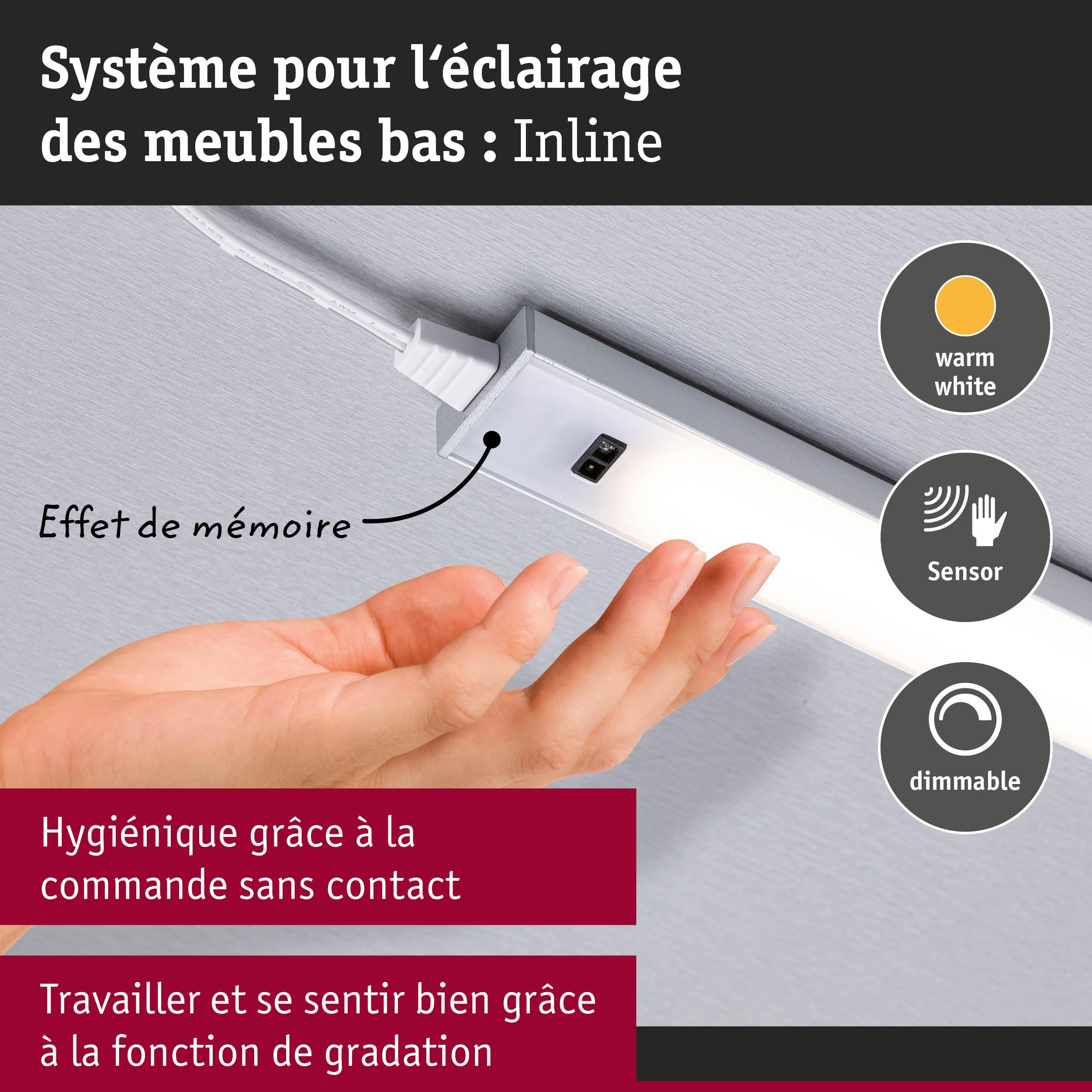 Le kit d'extension comprenant deux éclairages de meubles Inline en Blanc dépoli discret et de longueur 550x26mm est le complément parfait du kit de démarrage Inline. Ces luminaires sont une solution élégante pour illuminer les plans de travail de manière optimale. La fonction de variation d'intensité permet de régler la température de couleur blanc chaud selon les besoins. De plus, l'entretien des luminaires est un jeu d'enfants, car les matériaux de haute qualité sont faciles à nettoyer. Le détecteur de proximité permet une mise en marche et un arrêt sans contact, ce qui contribue en outre à un mode de travail hygiénique. De plus, la fonction mémoire enregistre la température de couleur paramétrée, ce qui évite de devoir la régler à chaque fois. Avec une température de couleur de 3000K, les luminaires diffusent un agréable éclairage blanc chaud.