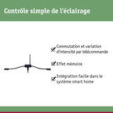 - Commute et fait varier l'intensité de tous les luminaires Plug & Shine jusqu'à une puissance totale de 75 watts.