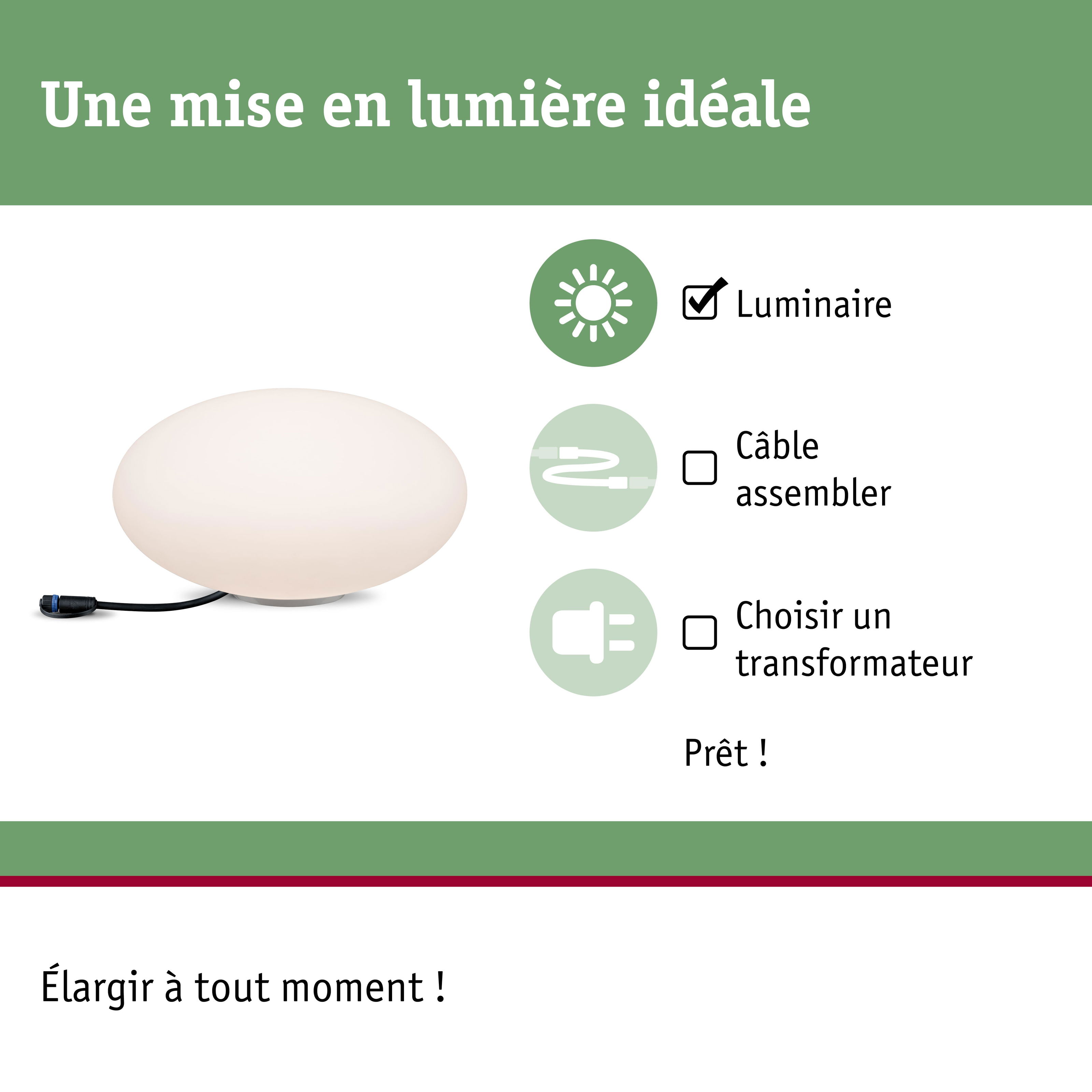 L'objet lumineux Stone Plug & Shine d'un diamètre de 35 cm est un véritable accroche-regard dans les massifs de fleur, sur la terrasse ou le balcon. Avec les transfos, connecteurs et autres luminaires de la série Plug & Shine, vous pouvez organiser en toute quiétude vos jeux de lumière pour l'extérieur.