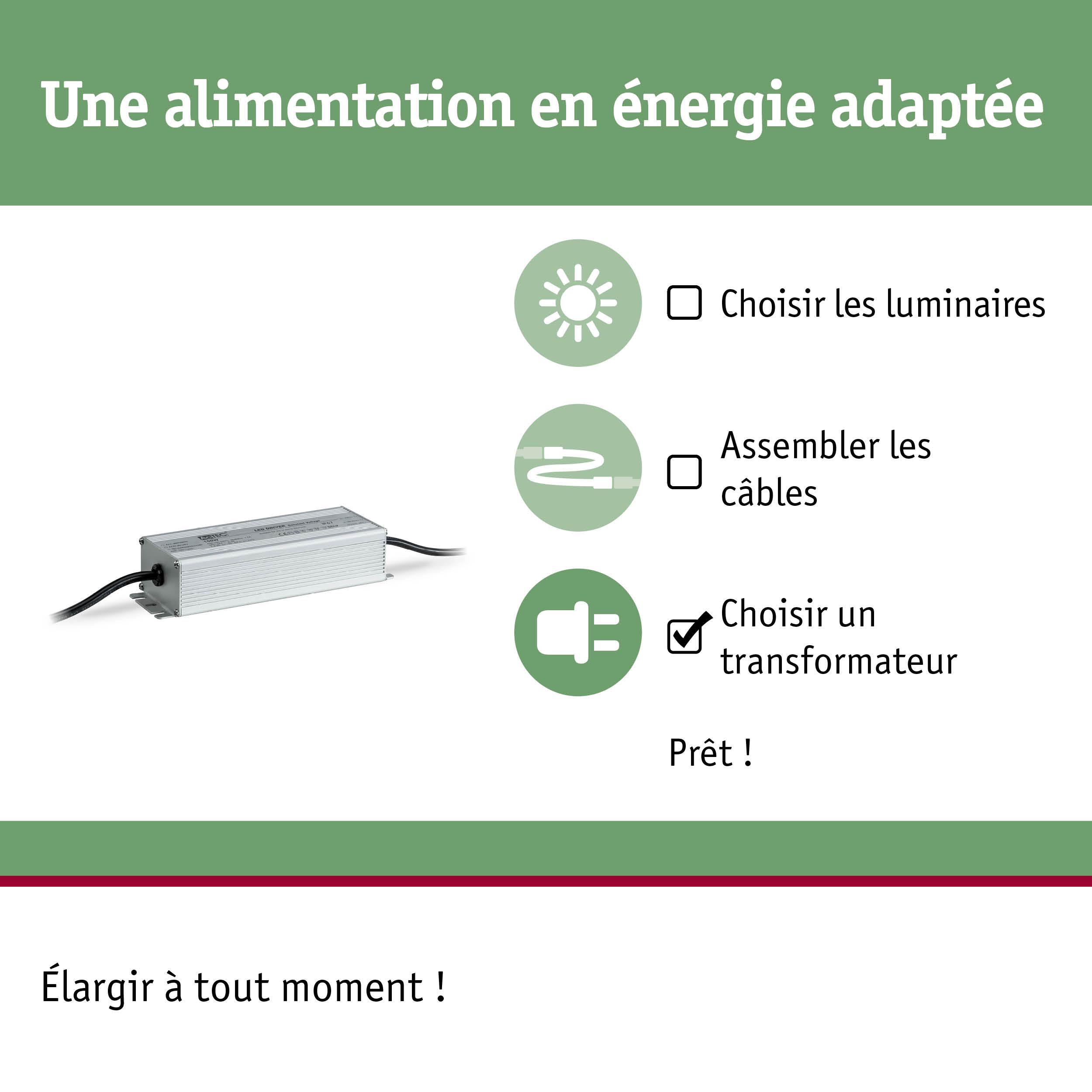 Le transfo Plug & Shine de 150 watts constitue la base de votre installation lumineuse d'extérieur, autour de la maison, sur la terrasse et dans le jardin. Combinez à votre guise différents luminaires et connecteurs de la série Plug & Shine jusqu'à une longueur de système maximale de 50 mètres.