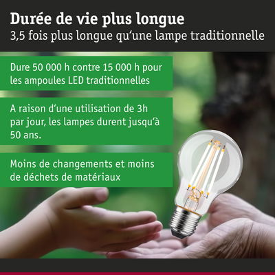 Les ampoules LED ultra efficaces de la gamme LED Eco-Line allient technologie innovante et durabilité pour un éclairage efficace et stylé. La consommation d'énergie réduite de 60% et la durée de vie nettement plus longue que les ampoules LED standard permettent de réduire considérablement les coûts énergétiques tout en préservant l'environnement. L'ampoule LED à filament claire s'adapte à toutes les douilles E27 courantes et produit, avec 3000K, une puissance de 5,7W, une lumière blanc chaud agréable sans teinte verte. Même les grands abat-jour sont éclairés de manière uniforme, ce qui apporte à chaque pièce une ambiance de bien-être harmonieuse. Selon les besoins, l'intensité lumineuse de l'ampoule peut être graduée sur 3 niveaux à l'aide d'un interrupteur conventionnel. Le variateur dispose d'une fonction mémoire. Les ampoules LED Paulmann portant le label Eye friendly produisent une lumière confortable qui préserve les yeux. Que ce soit pour travailler, lire ou se détendre, les ampoules contribuent à un meilleur confort visuel.
