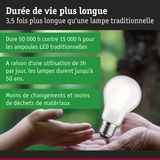 Les ampoules LED ultra efficaces de la gamme LED Eco-Line allient technologie innovante et durabilité pour un éclairage efficace et stylé. La consommation d'énergie réduite de 60% et la durée de vie nettement plus longue que les ampoules LED standard permettent de réduire considérablement les coûts énergétiques tout en préservant l'environnement. L'ampoule LED à filament dépolie s'adapte à toutes les douilles E27 courantes et produit, avec 3000K, une puissance de 5,7W, une lumière blanc chaud agréable sans teinte verte. Même les grands abat-jour sont éclairés de manière uniforme, ce qui apporte à chaque pièce une ambiance de bien-être harmonieuse. Selon les besoins, l'intensité lumineuse de l'ampoule peut être graduée sur 3 niveaux à l'aide d'un interrupteur conventionnel. Le variateur dispose d'une fonction mémoire. Les ampoules LED Paulmann portant le label Eye friendly produisent une lumière confortable qui préserve les yeux. Que ce soit pour travailler, lire ou se détendre, les ampoules contribuent à un meilleur confort visuel.