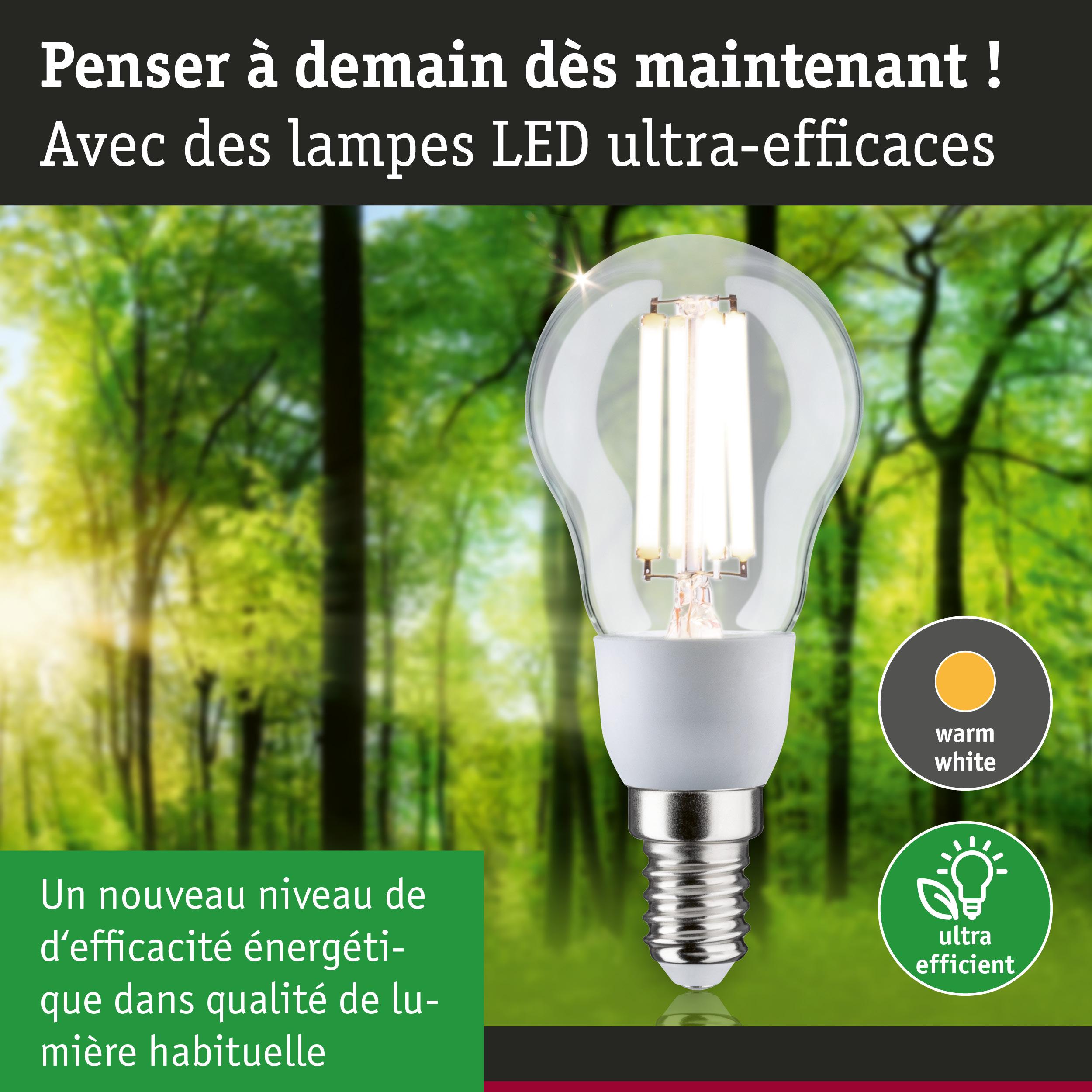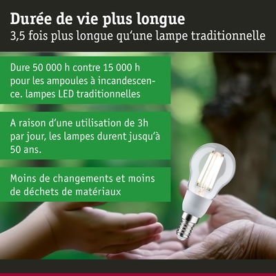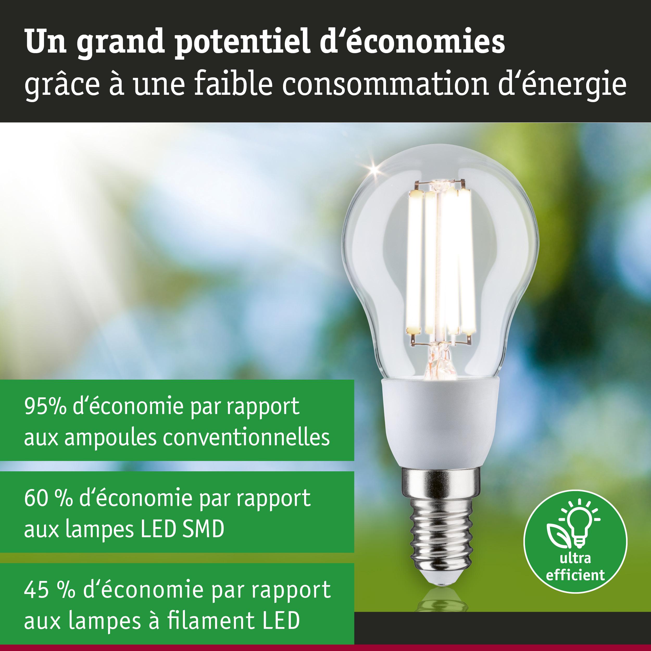 Les ampoules ultra efficaces de l'Eco-Line combinent innovation et durabilité. Grâce à une consommation d'énergie réduite de 60 % et à une durée de vie résolument plus longue que celle des ampoules LED standard, il est possible de réduire considérablement les coûts énergétiques tout en préservant l'environnement. La sphérique à filament claire avec 4000K, une puissance de 2,5W et 525lm diffuse un éclairage uniforme agréable sans teinte verdâtre. L’ampoule est compatible avec les douilles E14 conventionnelles. Grâce à leur forme compacte, les ampoules sphériques sont idéales pour les petits luminaires. Les lampes LED Paulmann portant le label Eye friendly produisent une lumière confortable qui préserve les yeux. Que ce soit pour travailler, lire ou se détendre, les lampes contribuent à un meilleur confort visuel.