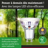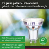 Les ampoules ultra efficaces de l'Eco-Line combinent innovation et durabilité. Grâce à une consommation d'énergie réduite de 60 % et à une durée de vie résolument plus longue que celle des ampoules LED standard, il est possible de réduire considérablement les coûts énergétiques tout en préservant l'environnement. Le réflecteur avec 4000K et d'une puissance de 2,5W watts et 450lm fournit une lumière dirigée sans teinte verte pour les projecteurs, spots et encastrés. Un cône de lumière vous permet de mettre en valeur votre déco ou des objets spécifiques de votre intérieur. L’ampoule est compatible avec les douilles GU10 conventionnelles. Les lampes LED Paulmann portant le label Eye friendly produisent une lumière confortable qui préserve les yeux. Que ce soit pour travailler, lire ou se détendre, les lampes contribuent à un meilleur confort visuel.