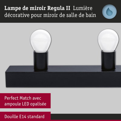 Resplendissant – La solution d'éclairage idéale pour la salle de bains. Ce kit pratique contient la réglette lumineuse Regula II en Noir, Opale, ainsi que les ampoules LED opales adaptées. Grâce à son indice de protection IP44 particulièrement élevé, la réglette lumineuse Regula II à 3 flammes est protégée contre les projections d’eau et convient donc parfaitement à une utilisation dans la salle de bains ou dans d’autres pièces humides. Avec son design moderne et épuré, elle s’intègre facilement dans n’importe quel style d’intérieur. La longueur de 45 cm est adaptée aux dimensions standard des miroirs et convient également parfaitement aux miroirs plus petits que l'on trouve souvent dans les WC invités. Sont incluses 3 ampoules LED sphériques en Noir, Opale qui confèrent à l’éclairage de miroir un look à la fois moderne et classique. Avec une puissance de 3x4,5W chacune, elles diffusent une lumière blanc chaud, rayonnante. Vous pouvez régler la luminosité en fonction de vos besoins. L'installation du Regula II est très simple : elle peut être montée sur le mur au-dessus ou à côté du miroir. Il suffit de visser les ampoules LED opales ou d’autres ampoules de votre choix munies d’une douille E14, pour qu’elle soit immédiatement opérationnelle. Plus rien ne s'oppose donc à une ambiance lumineuse agréable dans la salle de bains. Pour nettoyer les luminaires, il est préférable d'utiliser un chiffon doux – évitez d'utiliser un chiffon en microfibre. Selon l'ampoule utilisée, la lampe est dimmable.
