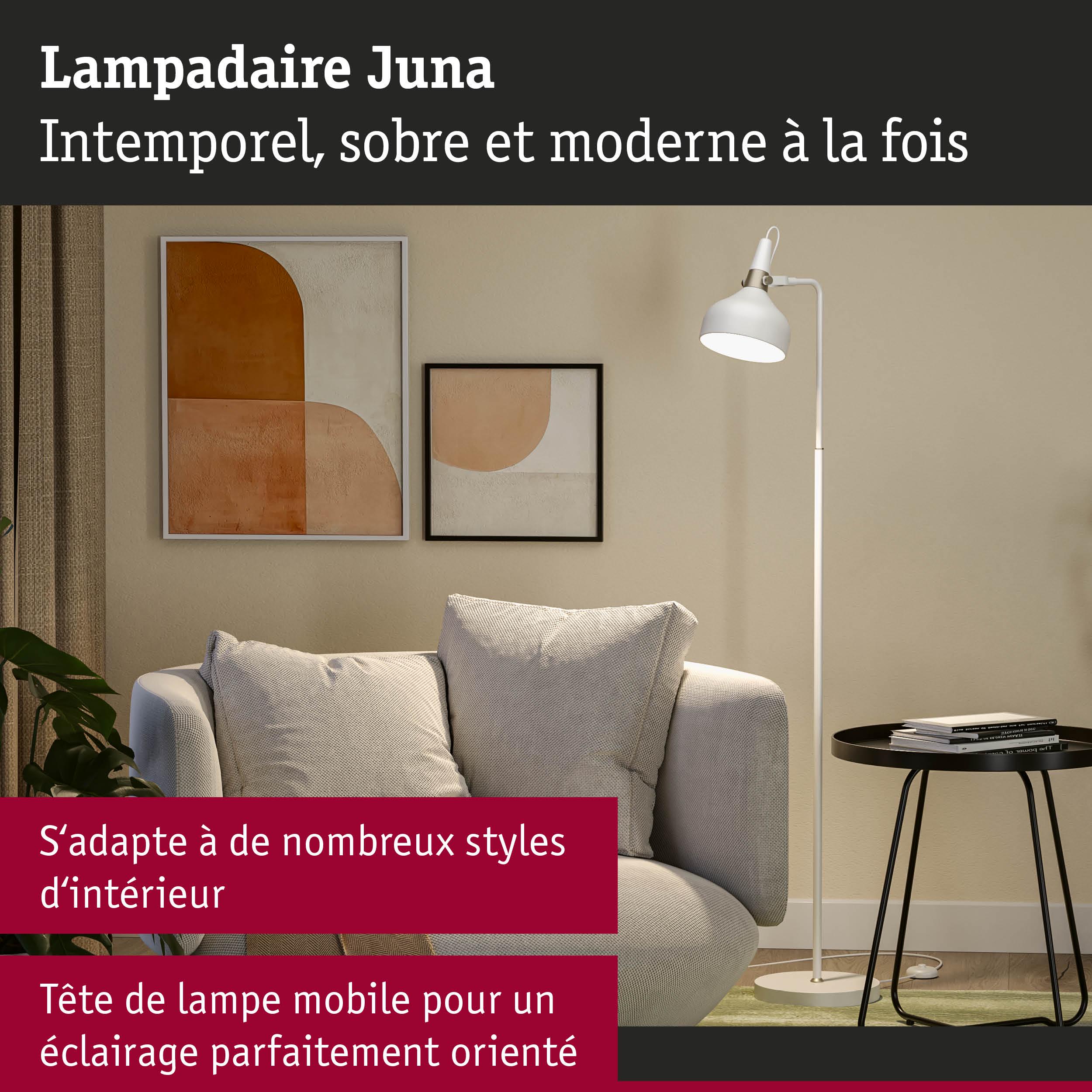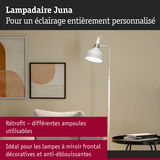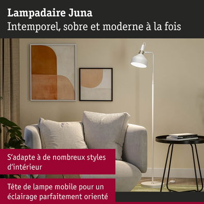 Avec ses formes et son design à la fois intemporels et modernes, la série de luminaires Juna s'adapte aux styles d'intérieur les plus divers tout en apportant des accents lumineux attrayants dans les espaces de vie. Les lampes à poser, lampadaires et suspensions de la série, assortis les uns aux autres, peuvent se combiner harmonieusement à votre guise. Le lampadaire blanc dépoli avec de très beaux accents doré champagne est utilisable de nombreuses manières et sera parfait comme éclairage additionnel à côté du lit, pour le coin lecture confortable ou à côté du canapé dans l'espace de vie. Sa finition de haute qualité lui confère non seulement un aspect attrayant, mais aussi une longue durée de vie. La tête mobile du luminaire permet d'orienter la lumière à volonté, tandis que le câble textile de couleur coordonnée garantit une utilisation confortable et sûre. Les ampoules recommandées sont notamment les lampes à calotte argentée décoratives avec culot E14, qui diffusent une lumière non éblouissante.