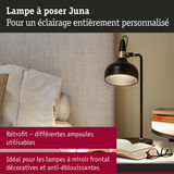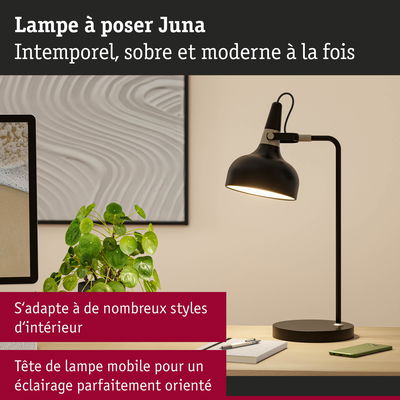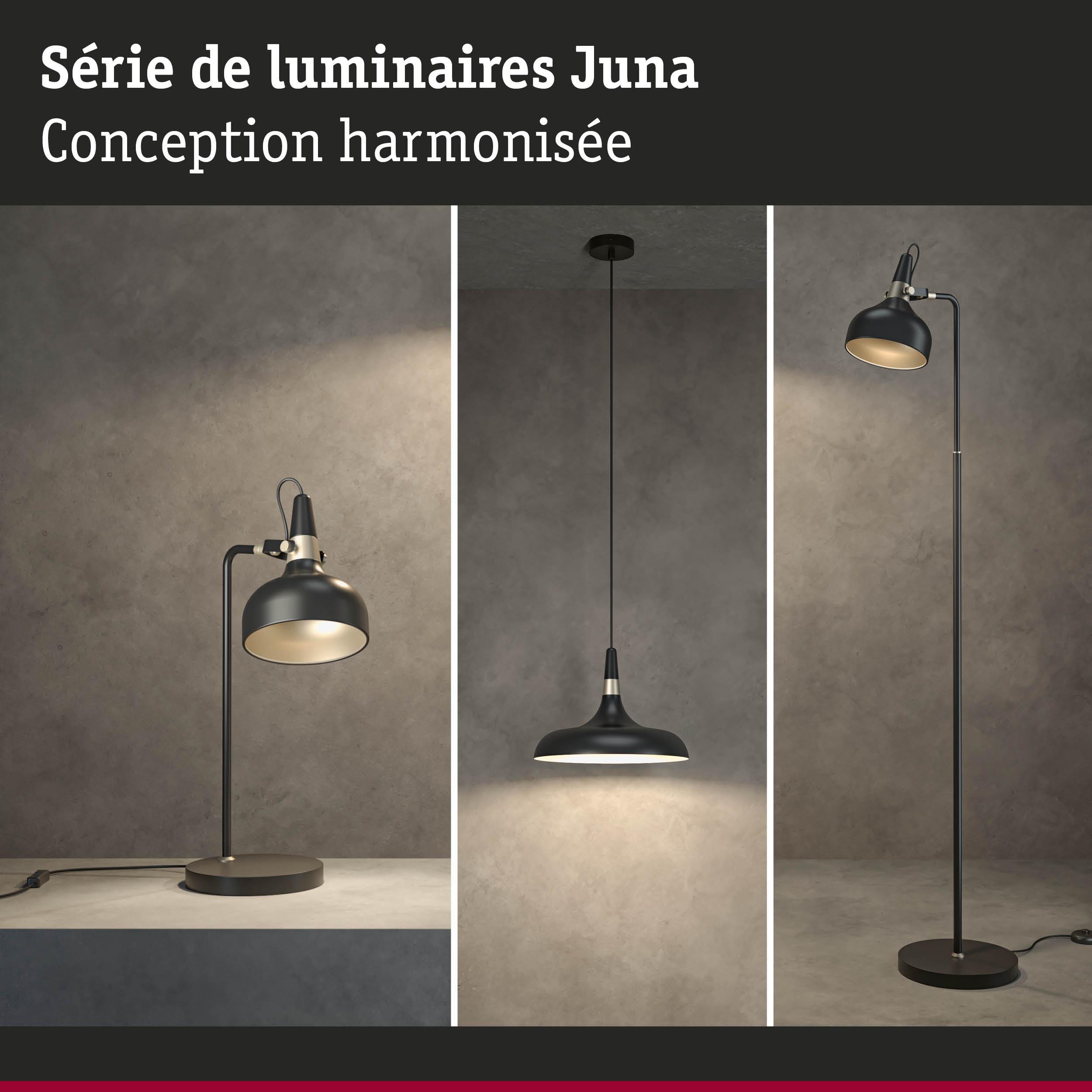 Avec ses formes et son design à la fois intemporels et modernes, la série de luminaires Juna s'adapte aux styles d'intérieur les plus divers tout en apportant des accents lumineux attrayants dans les espaces de vie. Les lampes à poser, lampadaires et suspensions de la série, assortis les uns aux autres, peuvent se combiner harmonieusement à votre guise. La lampe à poser noir dépoli avec de très beaux accents couleur doré champagne est polyvalente et convient parfaitement sur une table de chevet, comme lampe de bureau ou comme éléments décoratif sur un buffet. Sa finition de haute qualité lui confère non seulement un aspect attrayant, mais aussi une longue durée de vie. La tête mobile du luminaire permet d'orienter la lumière à volonté, tandis que le câble textile de couleur coordonnée garantit une utilisation confortable et sûre. Les ampoules recommandées sont notamment les lampes à calotte argentée décoratives avec culot E14, qui diffusent une lumière non éblouissante.