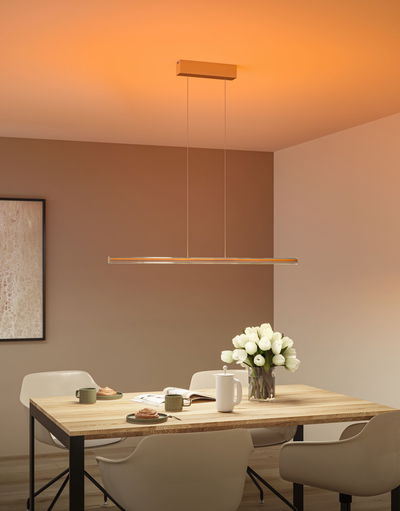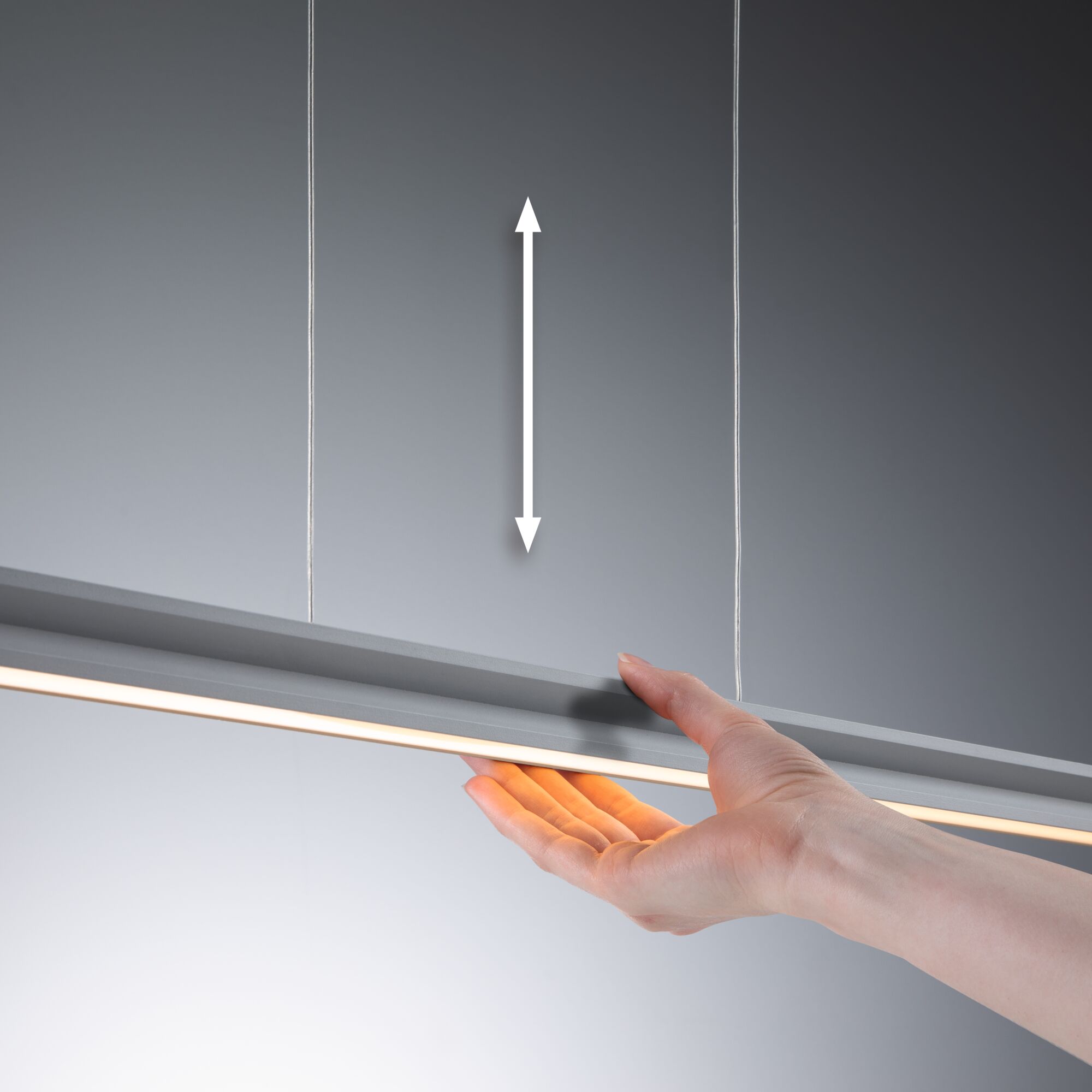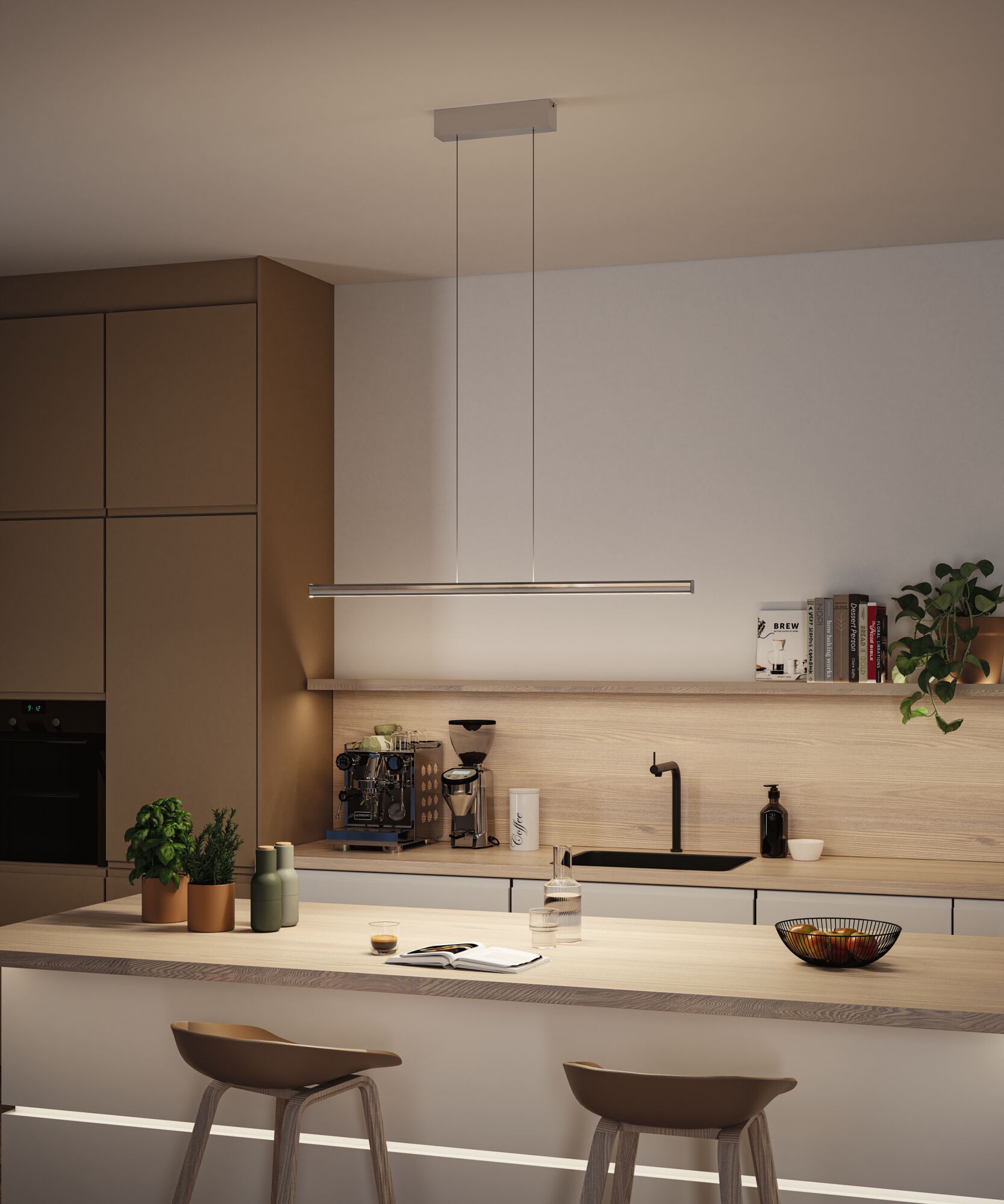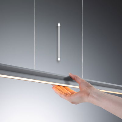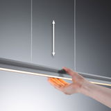 La suspension Lesko est idéale pour éclairer les tables de salle à manger, les cuisines ou les postes de travail. Grâce à ses deux émissions lumineuses, une vers le haut et une vers le bas, elle offre une flexibilité maximale pour créer des ambiances lumineuses personnalisées. Vers le haut, tout est possible, de l'éclairage continu unicolore aux effets lumineux colorés. Outre l'éclairage coloré, vous pouvez également choisir une lumière blanc chaud de 3000 K pour créer une ambiance chaleureuse. Grâce à la commande de lumière blanche intelligente Tunable White, la couleur de feu peut être réglée et atténuée en continu vers le bas, de l'éclairage blanc chaud relaxant au blanc lumière du jour pour travailler (2700 K - 6500 K). Une fonction mémoire intégrée enregistre les derniers réglages d'éclairage sélectionnés jusqu'à la prochaine mise en marche. La télécommande fournie permet de piloter séparément les deux émissions lumineuses. Le design sobre de la suspension en Argent mats'intègre harmonieusement dans des styles d'intérieur variés. Grâce au principe « Easy Up-and-Down », la longueur de la suspension est facile à ajuster sans outil selon les besoins, grâce au câble filigrane.