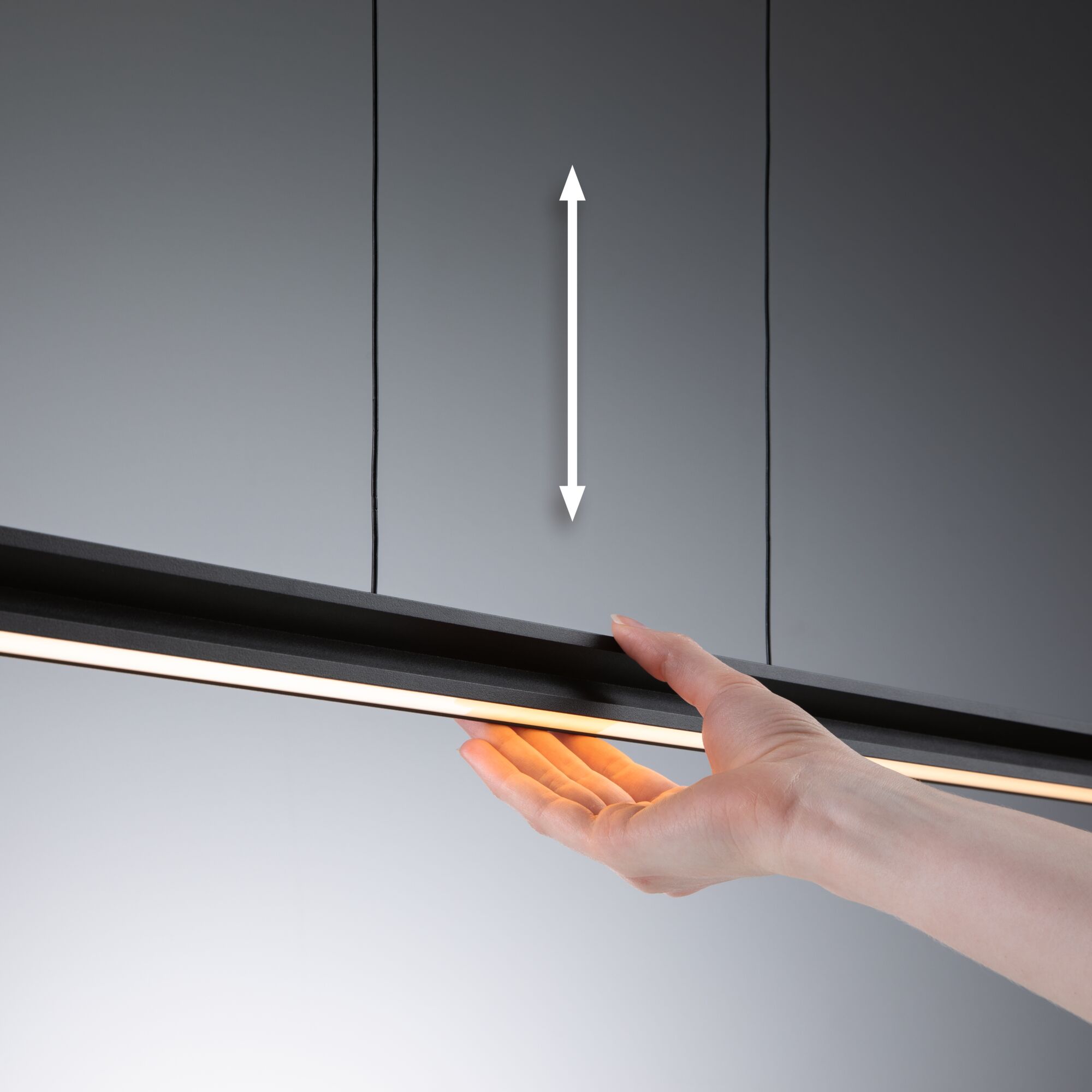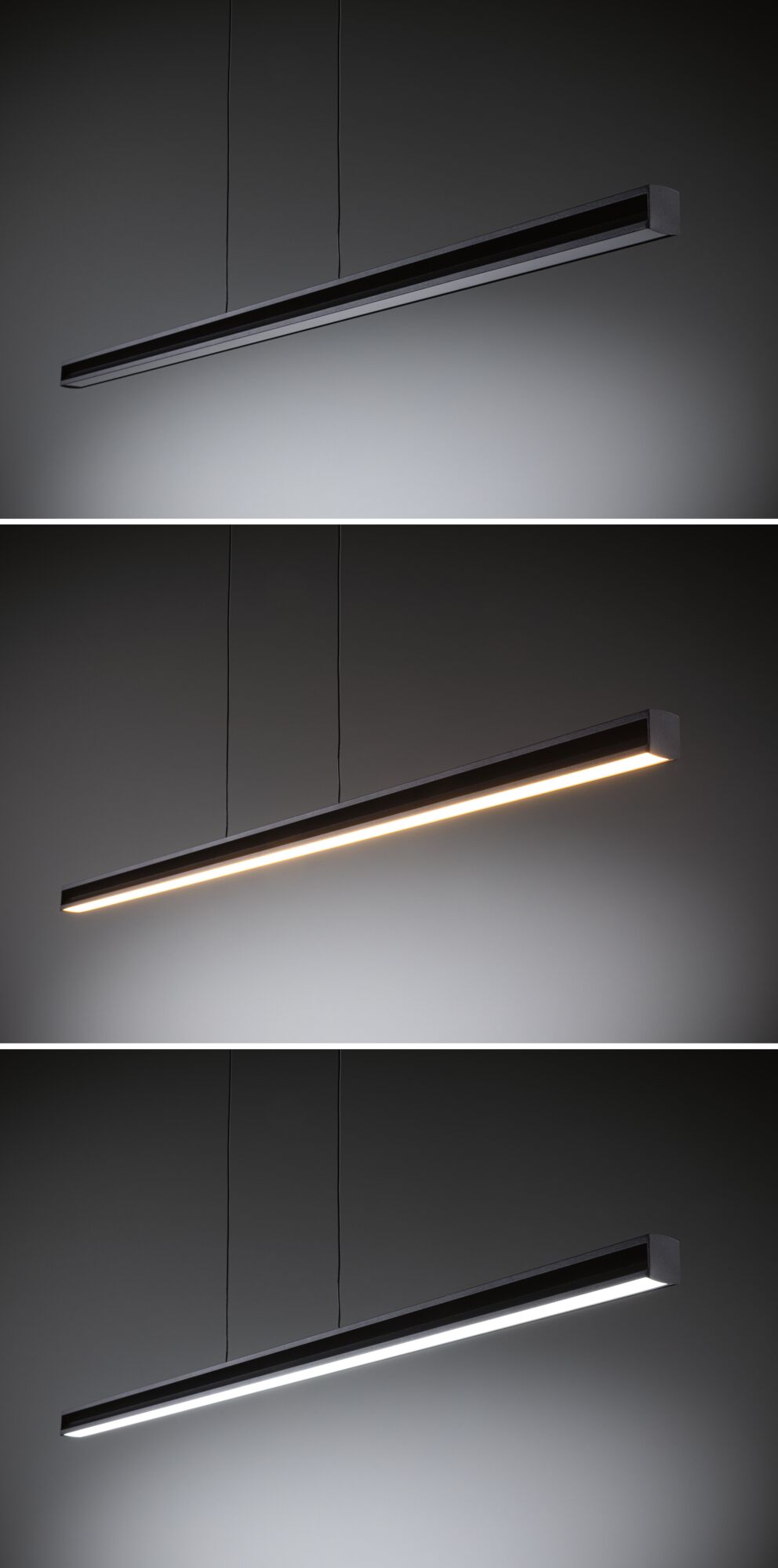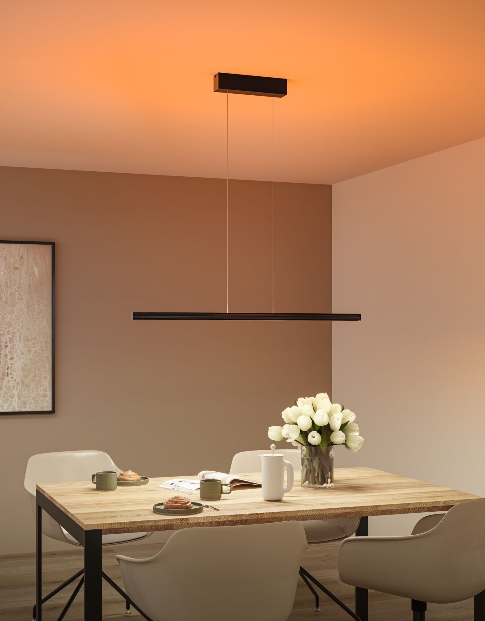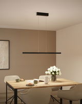 La suspension Lesko est idéale pour éclairer les tables de salle à manger, les cuisines ou les postes de travail. Grâce à ses deux émissions lumineuses, une vers le haut et une vers le bas, elle offre une flexibilité maximale pour créer des ambiances lumineuses personnalisées. Vers le haut, tout est possible, de l'éclairage continu unicolore aux effets lumineux colorés. Outre l'éclairage coloré, vous pouvez également choisir une lumière blanc chaud de 3000 K pour créer une ambiance chaleureuse. Grâce à la commande de lumière blanche intelligente Tunable White, la couleur de feu peut être réglée et atténuée en continu vers le bas, de l'éclairage blanc chaud relaxant au blanc lumière du jour pour travailler (2700 K - 6500 K). Une fonction mémoire intégrée enregistre les derniers réglages d'éclairage sélectionnés jusqu'à la prochaine mise en marche. La télécommande fournie permet de piloter séparément les deux émissions lumineuses. Le design sobre de la suspension en Noir mats'intègre harmonieusement dans des styles d'intérieur variés. Grâce au principe « Easy Up-and-Down », la longueur de la suspension est facile à ajuster sans outil selon les besoins, grâce au câble filigrane.