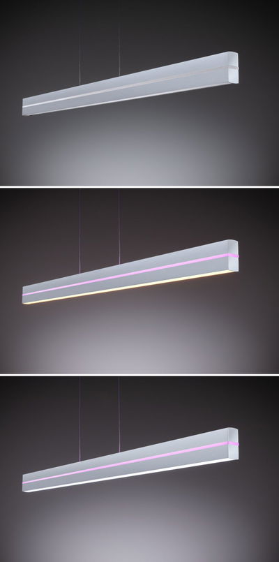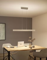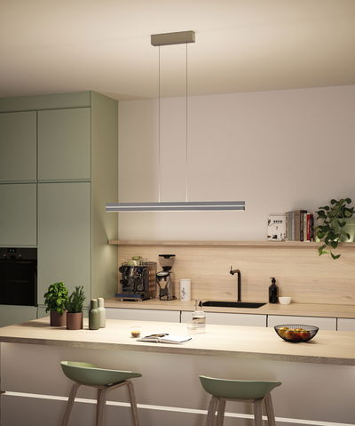 La suspension Raiko est idéale pour éclairer les tables de salle à manger, les cuisines ou les postes de travail. Grâce à ses deux émissions lumineuses, une vers le haut et une vers le bas, elle offre une flexibilité maximale pour créer des ambiances lumineuses personnalisées. Vers le haut, tout est possible, de l'éclairage continu unicolore aux effets lumineux colorés. Il est possible d'allumer une fine réglette lumineuse en même temps que la lumière émise vers le haut qui apportera une touche décorative supplémentaire. Outre l'éclairage coloré, vous pouvez également choisir une lumière blanc chaud de 3000 K pour créer une ambiance chaleureuse. Grâce à la commande de lumière blanche intelligente Tunable White, la couleur de feu peut être réglée et atténuée en continu vers le bas, de l'éclairage blanc chaud relaxant au blanc lumière du jour pour travailler (2700 K - 6500 K). Une fonction mémoire intégrée enregistre les derniers réglages d'éclairage sélectionnés jusqu'à la prochaine mise en marche. La télécommande fournie permet de piloter séparément les deux émissions lumineuses. Le design sobre de la suspension en Argent mat s'intègre harmonieusement dans des styles d'intérieur variés. Grâce au principe « Easy Up-and-Down », la longueur de la suspension est facile à ajuster à la hauteur souhaitée sans outil, grâce au câble filigrane.