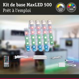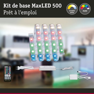 Les rubans MaxLED sont si puissants qu'ils peuvent être utilisés sans problème comme éclairage d'intérieur. Ils sont particulièrement impressionnants dans les profilés. Grâce à la commande de couleur, vous pouvez créer une ambiance personnalisée, que ce soit un éclairage permanent monochrome ou des effets lumineux multicolores. Une diode blanche (W) assure de plus une confortable lumière blanc chaud et rend superflu le mélange d'un ton blanc avec les couleurs rouge, vert et bleu (RGB). Le kit de base comprend n plus des rubans un ballast électronique adapté et une unité de commande avec télécommande. Il est possible, au besoin, d'étendre le système à l'aide de rubans et de connecteurs supplémentaires. Veuillez prendre en compte à la conception la longueur maximale indiquée ci-dessous. Celle-ci ne peut être dépassée.