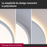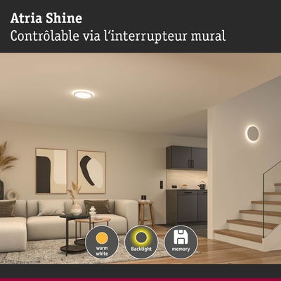 Le panneau polyvalent Atria Shine, d'un diamètre de 290mm, offre un éclairage à la fois direct et indirect, grâce à sa technologie Backlight et Frontlight contrôlable séparément. Celui-ci est facilement pilotable via un commutateur mural en l'allumant et en l'éteignant rapidement plusieurs fois. Il est donc possible de choisir entre un éclairage complet, un Frontlight uniquement ou un Backlight d'ambiance uniquement, en fonction de l'humeur ou de l'application. Grâce à la fonction mémoire, le scénario d'éclairage choisi est enregistré et à la prochaine mise en marche, le luminaire s’allumera avec l'intensité lumineuse préréglée. Le panneau assure un éclairage uniforme dans les espaces intérieurs et crée une atmosphère confortable grâce à la couleur de lumière blanc chaud de 3000K. Le design sobre du panneau séduit par son design particulièrement plat et la technologie de Backlight d'ambiance confère au panneau un aspect discret et presque flottant. Le montage au mur ou au plafond est particulièrement simple et facile grâce au clip de fixation rapide et à la fermeture à vis.