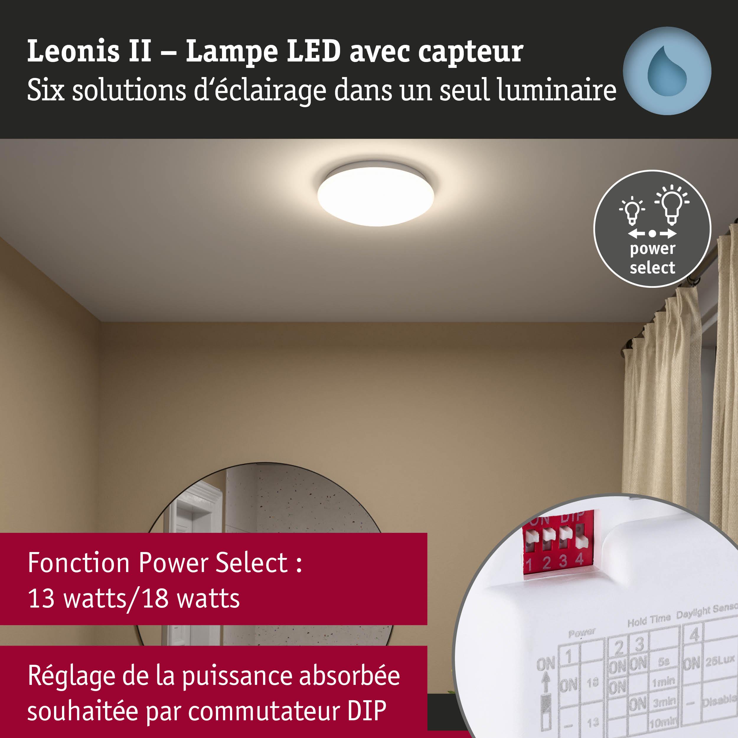 Avec la fonction White Select et le détecteur de mouvement et détecteur crépusculaire intégré, le plafonnier Leonis est un multitalent hors pair. En plus de ces nombreuses possibilités d'éclairage, il garantit un haut niveau de sécurité, de confort, de performance énergétique avec la commande d'éclairage automatique. Grâce à l'indice de protection IP44 élevé, ce plafonnier de couleur Blanc convient bien pour les pièces humides et peut être utilisé à l'intérieur comme à l'extérieur. Il est donc idéal pour les utilisations dans les salles de bain, les couloirs, les cuisines, les réserves ou sur les terrasses. La température de couleur de la lumière peut être réglée, même après l'installation, grâce à un DIP switch pour l'adapter aux envies. La fonction innovante Power Select permet de contrôler la puissance absorbée par le luminaire dans une plage de 13 W et 18 W selon le domaine d'application. Si besoin, le détecteur crépusculaire intégré commande automatiquement la lumière à partir d'une luminosité souhaitée, et le détecteur de mouvement HF intégré déclenche la lumière dès que quelqu'un s'approche du luminaire. La distance et la durée d'éclairage peuvent être réglées à l'aide du capteur haute fréquence. La durée d'éclairage peut être réglée selon différents intervalles de temps : par exemple, 5 secondes, 1 minute, 3 minutes ou jusqu'à 10 minutes. En combinaison avec la fonction Power Select, la consommation d'énergie s'en trouve donc optimisée, ce qui réduit non seulement les coûts, mais profite aussi à l'environnement. En matière de durabilité, le plafonnier Leonis convainc en outre par sa durée de vie particulièrement longue de 50.000 heures. L'idéal pour une utilisation à long terme tout en préservant les ressources !