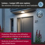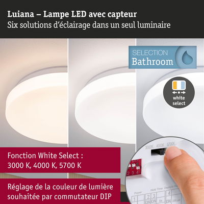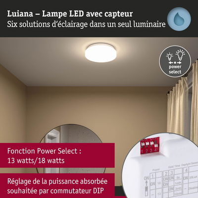 Avec la fonction White Select et le détecteur de mouvement et détecteur crépusculaire intégré, le plafonnier Luiana est un multitalent hors pair. En plus de ces nombreuses possibilités d'éclairage, il garantit un haut niveau de sécurité, de confort, de performance énergétique avec la commande d'éclairage automatique. Grâce à l'indice de protection IP44 élevé, ce plafonnier de couleur Blanc convient bien pour les pièces humides et peut être utilisé à l'intérieur comme à l'extérieur. Il est donc idéal pour les utilisations dans les salles de bain, les couloirs, les cuisines, les réserves ou sur les terrasses. La température de couleur de la lumière peut être réglée, même après l'installation, grâce à un DIP switch pour l'adapter aux envies. La fonction innovante Power Select permet de contrôler la puissance absorbée par le luminaire dans une plage de 13 W et 18 W selon le domaine d'application. Si besoin, le détecteur crépusculaire intégré commande automatiquement la lumière à partir d'une luminosité souhaitée, et le détecteur de mouvement HF intégré déclenche la lumière dès que quelqu'un s'approche du luminaire. La distance et la durée d'éclairage peuvent être réglées à l'aide du capteur haute fréquence. La durée d'éclairage peut être réglée selon différents intervalles de temps : par exemple, 5 secondes, 1 minute, 3 minutes ou jusqu'à 10 minutes. En combinaison avec la fonction Power Select, la consommation d'énergie s'en trouve donc optimisée, ce qui réduit non seulement les coûts, mais profite aussi à l'environnement. En matière de durabilité, le plafonnier Luiana convainc en outre par sa durée de vie particulièrement longue de 50.000 heures. L'idéal pour une utilisation à long terme tout en préservant les ressources !