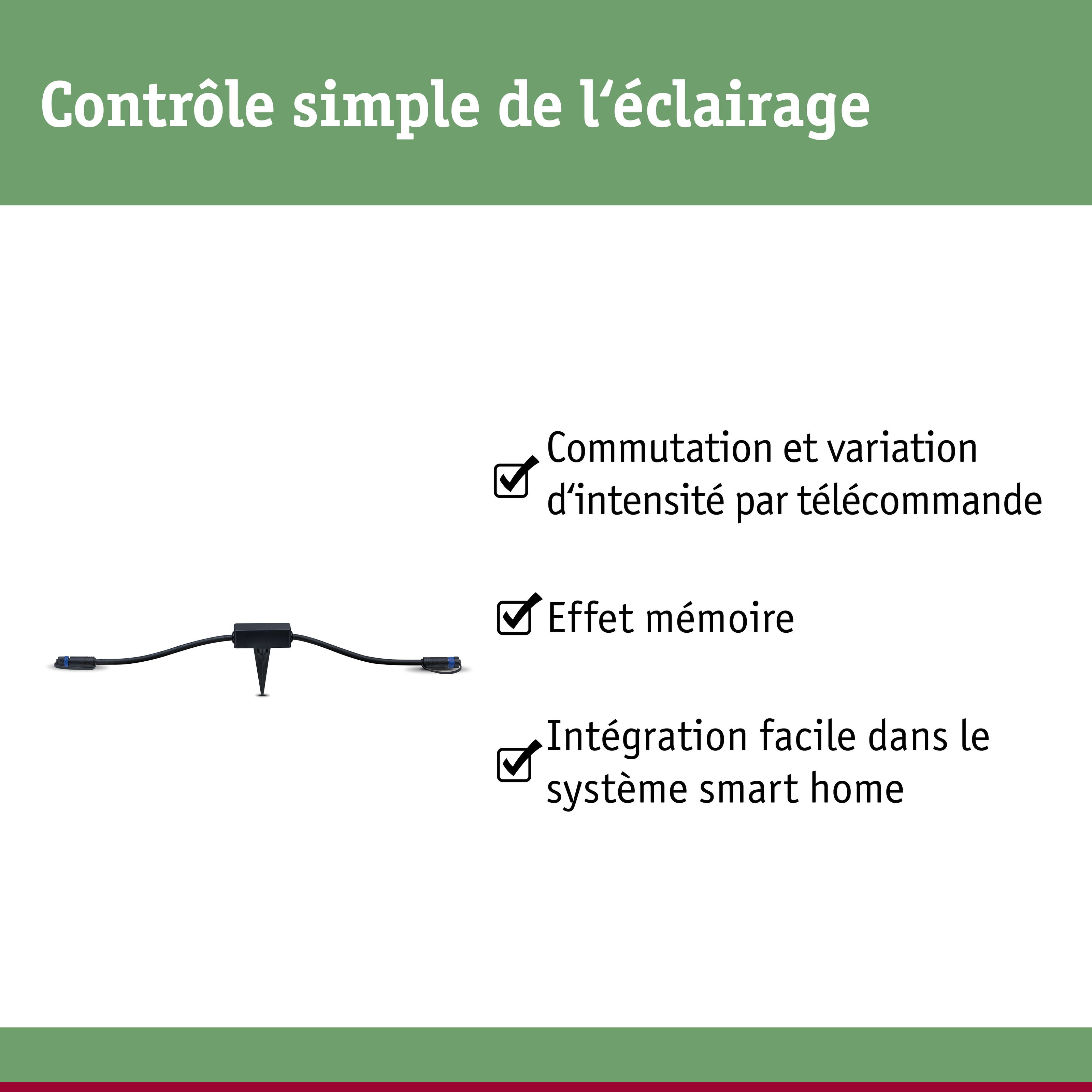 - Commute et fait varier l'intensité de tous les luminaires Plug & Shine jusqu'à une puissance totale de 75 watts.