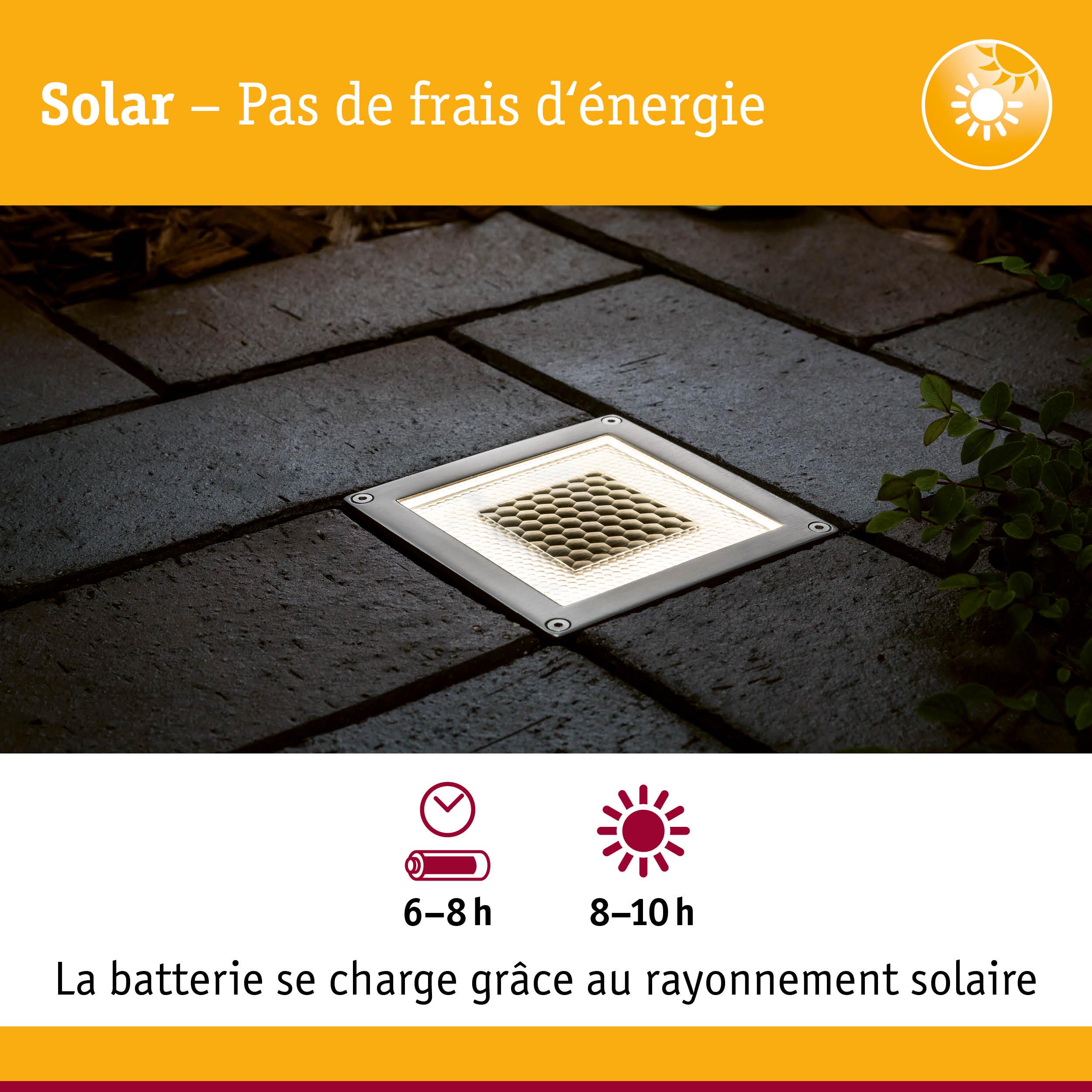 De la lumière dans tout le jardin, le tout sans le moindre câble : c'est maintenant possible grâce à cet encastré de sol solaire. Grâce aux cellules solaires, l'éclairage encastré n'utilise pas du tout d'électricité. Durant la journée, les batteries interchangeables se rechargent au soleil et les LED commencent à briller une fois la nuit tombée. Cet encastré de sol est, grâce à l'indice de protection IP67, étanche et inoxydable et il est adapté aux zones accessibles en plein air - l'éclairage résiste sans problème jusqu'à un poids de 1000 kg.