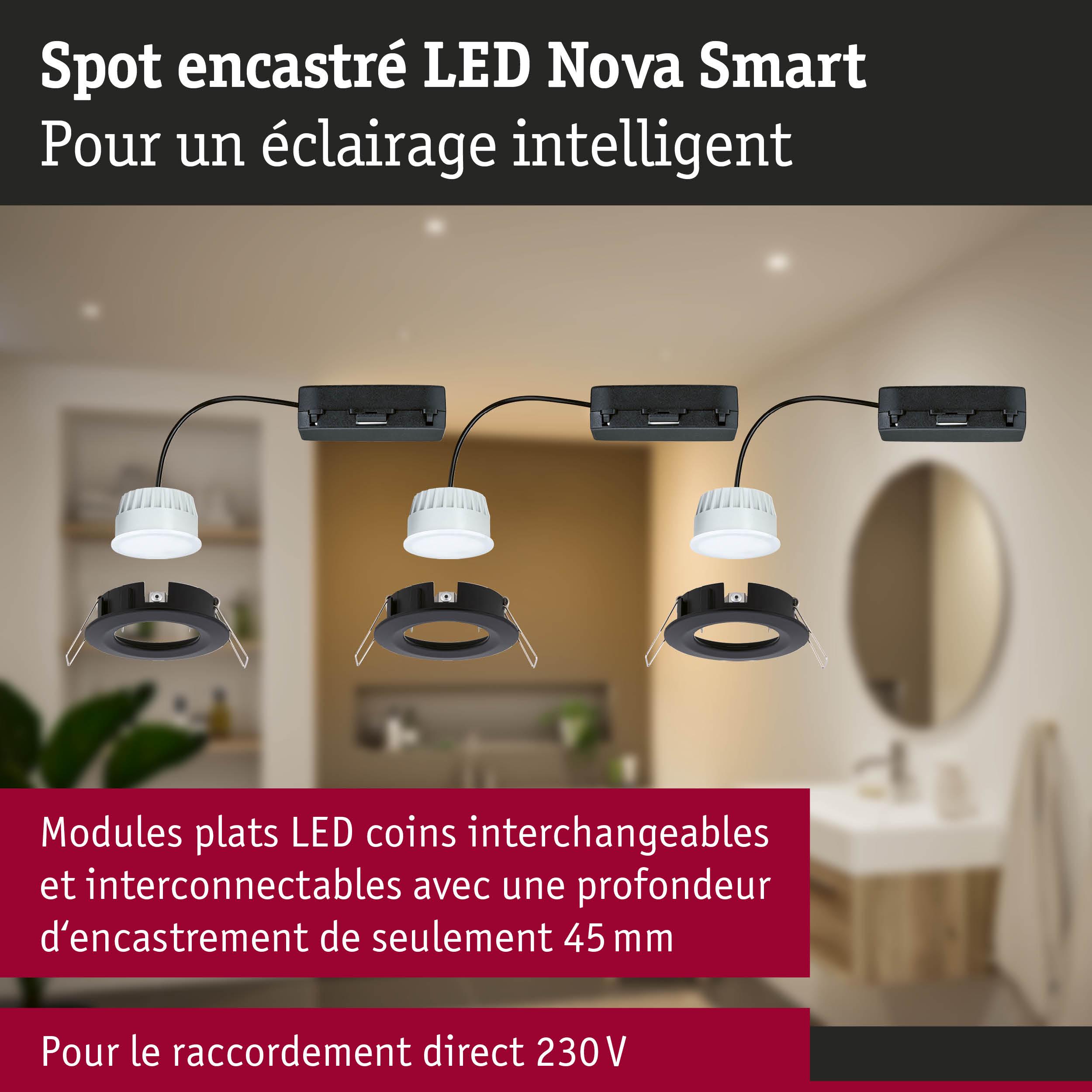 Le set de spots encastrés intelligents Nova Coin en Noir mat avec fonction de changement de couleur confère à chaque pièce une ambiance lumineuse personnalisée. Trois ampoules LED interchangeables sont fournies avec des bagues de montage en alu de haute qualité. Grâce à une protection IP particulièrement élevée de IP44, les luminaires sont également parfaits pour les pièces humides car il est protégé contre les projections d’eau. Avec une puissance de 3x6 watts et le système de contrôle Zigbee 3.0, ils fournissent une solution d'éclairage efficace et innovante. ZigBee 3.0 est un protocole de transmission radio qui met en réseau les appareils de différents fabricants. Ainsi, les luminaires peuvent être pilotés individuellement ou collectivement via une application, une télécommande ou une commande vocale : La fonction Tunable White permet de régler en continu la température de couleur en fonction des besoins, qu'il s'agisse d'une lumière dorée confortable et chaude (2200 K) ou d'un blanc lumière du jour sobre et lumineux (6500 K). Leur fonction de variation d’intensité en continu permet un ajustement individuel de la luminosité offrant deux effets majeurs : vous jouissez d'une lumière de travail claire tout en baignant dans une ambiance cocooning. Les spots encastrés intelligents peuvent être allumés et éteints facilement et confortablement à l'aide d'un interrupteur conventionnel. La fonction mémoire intégrée se souvient toujours du dernier réglage d’éclairage utilisé – pour un confort maximal. Le montage est particulièrement simple et efficace grâce aux Coins chaînables et interchangeables, à la faible profondeur d'encastrement (seulement 45 mm) et au raccordement direct en 230 V.