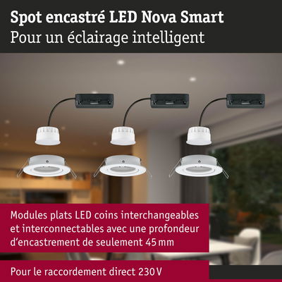 16 millions de couleurs, 16 millions d'ambiances lumineuses – Le set de spots encastrés intelligents Nova Coin en Blanc dépoli avec fonction de changement de couleur confère à chaque pièce une ambiance lumineuse personnalisée. La livraison comprend trois ampoules LED interchangeables, y compris des bagues de montage en alu de haute qualité. Avec une puissance de 3x6 watts et le système de contrôle Zigbee 3.0 RGBW, ils fournissent une solution d'éclairage efficace et innovante. ZigBee 3.0 est un protocole de transmission radio qui met en réseau les appareils de différents fabricants. Ainsi, les luminaires peuvent être pilotés individuellement ou collectivement via une application, une télécommande ou une commande vocale : Qu'il s'agisse d'une lumière dorée chaude et confortable (2200 K), d'un blanc lumière du jour sobre et lumineux (6500 K) ou de dégradés de couleurs multicolores, la combinaison de Tunable White, RGB et de la fonction de variation d’intensité offre d'innombrables possibilités. Les spots encastrés intelligents peuvent être allumés et éteints facilement et confortablement à l'aide d'un interrupteur conventionnel. La fonction mémoire intégrée se souvient toujours du dernier réglage d’éclairage utilisé – pour un confort maximal. Grâce à la capacité de pivotement des luminaires, la lumière se diffuse précisément là où vous le souhaitez. Le montage est particulièrement simple et efficace grâce aux Coins chaînables et interchangeables, à la faible profondeur d'encastrement (seulement 45 mm) et au raccordement direct en 230 V.