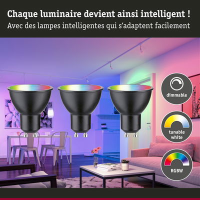 Le réflecteur LED (lot de 3) en Noir mat avec RGBW+, une puissance de 3x4,8W et 3x350lm crée une lumière uniforme agréable. L’ampoule est compatible avec les douilles conventionnelles GU10 et convient notamment pour les systèmes rails et câbles. L'ampoule est compatible Zigbee 3.0 3.0. ZigBee est un protocole de transmission radio qui met en réseau les appareils de différents fabricants. Selon l'ambiance désirée, vous pouvez choisir entre un blanc chaud véritable, une lumière colorée et d'autres effets différents. Les réflecteurs fournissent une lumière dirigée dans les luminaires en suspension, les spots et les projecteurs. Ils diffusent la lumière uniquement vers l'avant et mettent en valeur la décoration ou les murs entiers par un éclairage ciblé. Les lampes LED Paulmann portant le label Eye friendly produisent une lumière confortable qui préserve les yeux. Que ce soit pour travailler, lire ou se détendre, les lampes contribuent à un meilleur confort visuel.