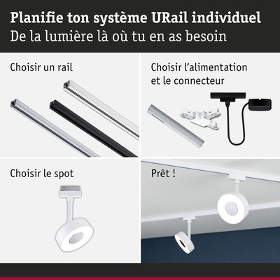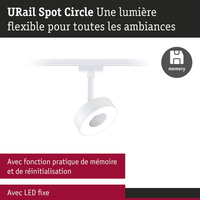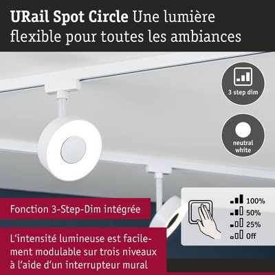 Le luminaire sur rail URail Circle blanc neutre en blanc de sécurité est compatible avec la plupart des articles URail. Avec sa fonction intégrée gradable sur 3 niveaux, ce luminaire offre trois intensités de lumière en actionnant plusieurs fois un simple commutateur traditionnel. Ainsi, avec les composants URail adéquats, il est possible de créer un système d'éclairage personnalisé jusqu'à une puissance totale de 1000 W.