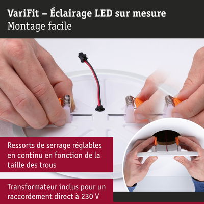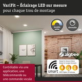 Utilisation flexible comme jamais ! Le panneau encastré Veluna VariFit en dimensions 215 x 215 mm séduit par sa surface lumineuse homogène et sans aucun bord. Avec sa hauteur de montage à plat de seulement 10 mm, ce panneau disparaît presque dans le plafond ou le mur. Adapté aux salles de bain ou aux pièces humides grâce à sa protection contre les projections d’eau. La surface satinée du diffuseur produit un agréable éclairage d'ambiance étendu. Les ressorts de serrage pour le montage sont réglables en continu pour s'adapter à toutes les tailles standards de trou de fixation comprises entre 60 et 190 mm, ce qui facilite grandement le remplacement des systèmes anciens. Grâce à la commande de lumière blanche intelligente Tunable White, vous réglez en continu et personnalisez la température de couleur du luminaire – du blanc lumière du jour de l'éclairage de travail jusqu'au blanc chaud de la lumière de relaxation. Le luminaire est compatible Zigbee 3.0 3.0. Zigbee 3.0 est un protocole de transmission radio qui met en réseau les appareils de différents fabricants.